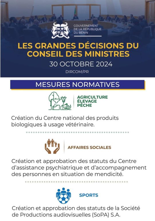 Le président Patrice Talon a présidé ce mercredi 30 octobre 2024 la réunion hebdomadaire du conseil des ministres. Comme à l’accoutumée plusieurs décisions importantes ont été prises et engagent davantage le Bénin sur la voix de développement.