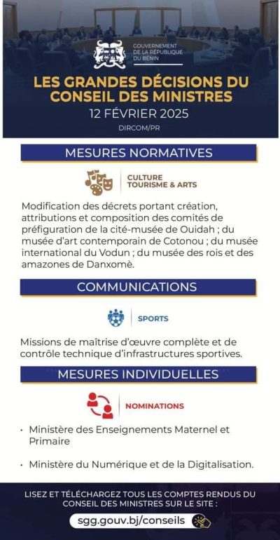 Les membres du gouvernement ont tenu ce mercredi 12 février 2025 leur rencontre hebdomadaire sous la houlette du président Patrice Talon. Plusieurs décisions importantes ont été prises et des nominations prononcées dans deux ministères.