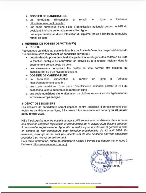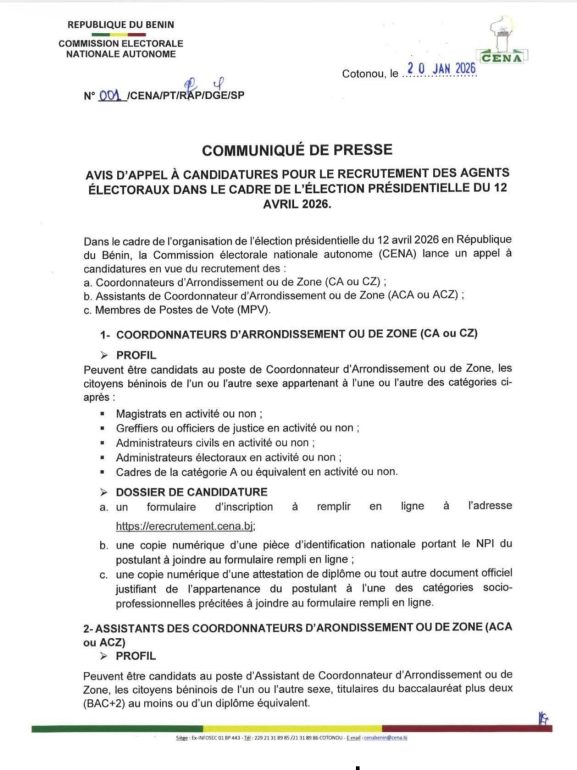 Ce recrutement intervient au lendemain de la proclamation des résultats définitifs des élections législatives du 11 janvier 2026. Les dossiers de candidature seront déposés du 20 janvier au 02 février 2026. Il est à noter que les postulants ayant déjà soumis leur candidature dans le cadre des élections couplées législatives et communales du 11 janvier doivent procéder à un nouvel enregistrement en ligne afin de mettre à jour leur dossier et garantir la prise en compte de leur candidature pour l’élection présidentielle du 12 avril 2026.